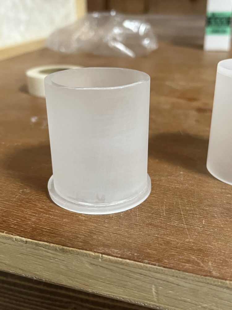 今回使用しているアクリルは#180で曇らせているので、アクリル接着剤があふれたところが逆に透明になっている。今回は#180で再度サンディングするときれいな曇りガラスすることができた。